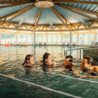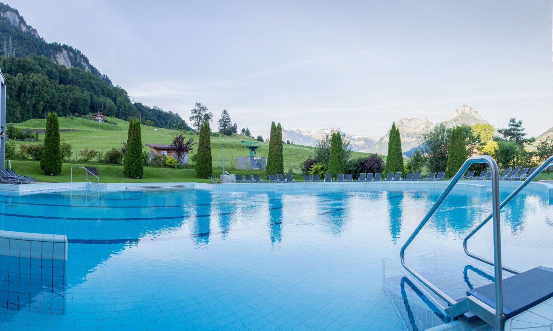 In the adventure pool, an indoor (210 m²) and outdoor pool (300 m²) with an adventurous whitewater channel, waterfall, 100 m slide, bubble loungers, massage jets, whirlpool and sunbathing lawn await you. An ideal family outing in Switzerland. More here